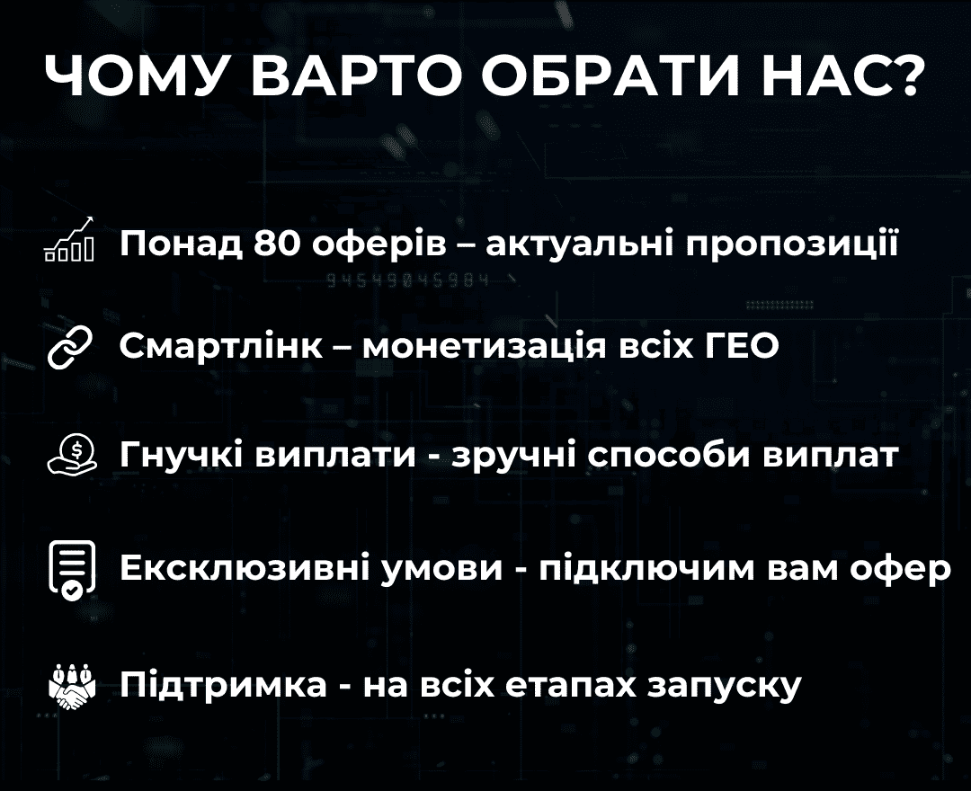 звʼязатись з намиНадійна партнерська програма з вигідними умовами та підтримкою для партнерів. Ми допомагаємо покращувати результати, оптимізувати стратегії та розвивати воронки. Новачкам надаємо корисні інструменти та можливості для старту без значних вкладень, а досвідченим партнерам – індивідуальні умови та доступ до ексклюзивних пропозицій.